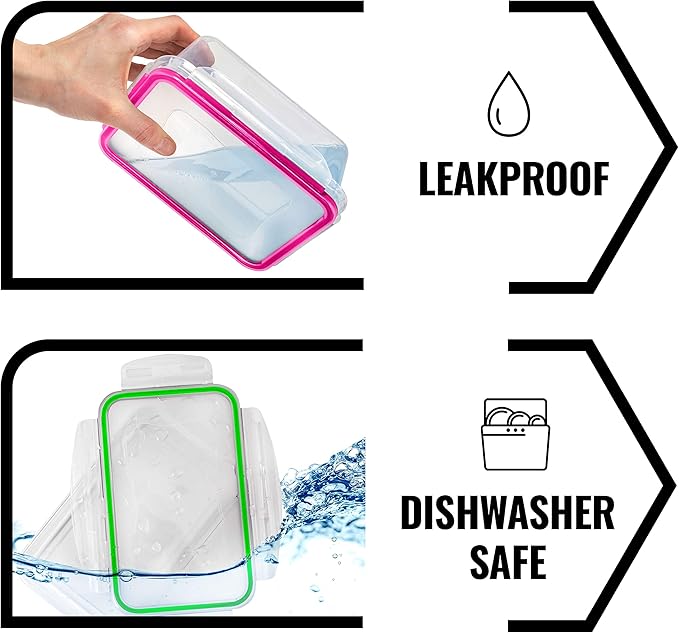 - Airtight and Leakproof Lids - Thanks to a leakproof 4-hinge snap-lock system, our food containers with lids form an airtight and secure seal for storage. Carry soups and sauces in your bag without worrying about spills. Store food in your fridge without smells leaking. With our plastic storage containers, your food stays fresh for longer. Stacks neatly in the pantry or fridge.