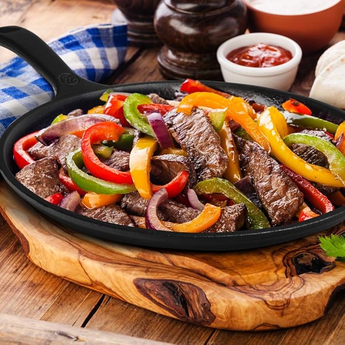 - VERSATILE: Use your new COMMERCIAL CHEF round cast iron pan 10.5” indoors or outdoors and create mouthwatering dishes the whole family will enjoy. Whip up a meal with this amazing cast iron griddle (15.9” x 10.6” x 0.7”) on a stove top, in an oven, broiler or even outdoors at a campfire. Fry, grill, or sear meat and veggies!