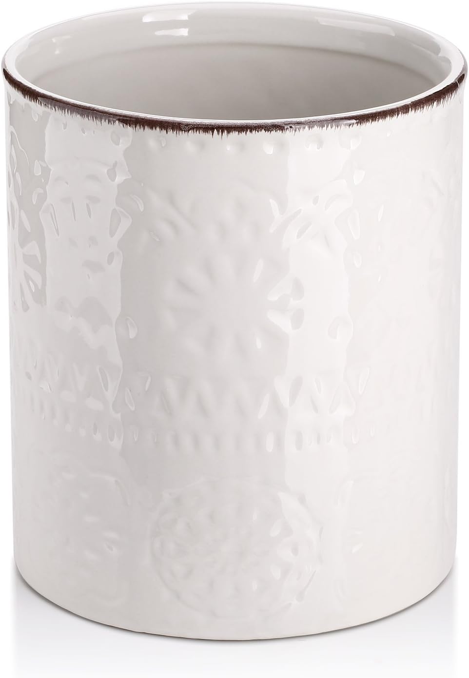 - Dimpled Imprint Fits Your Kitchen DÉcor. Beautiful design, awesome color and modern look must be a perfect and elegant compliment to your kitchen. This farmhouse white utensil holder for countertop will catch your eye at first sight.