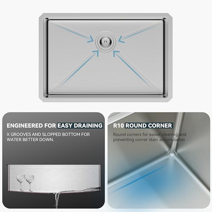 - This 26 inch undermount sink with R10 tight radius round corner design. Increase sink space cleaning.Easy to clean and long-lasting.