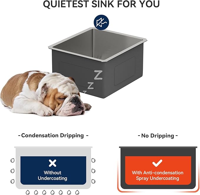 - Effortlessly clean the stainless steel kitchen sink with R10 round corner and X grooves water guideline for quick water drainage and residue washing, accompanied by rubber pads and heavy paint coating underneath for anti-dampening, vibration prevention, and cabinet base protection.