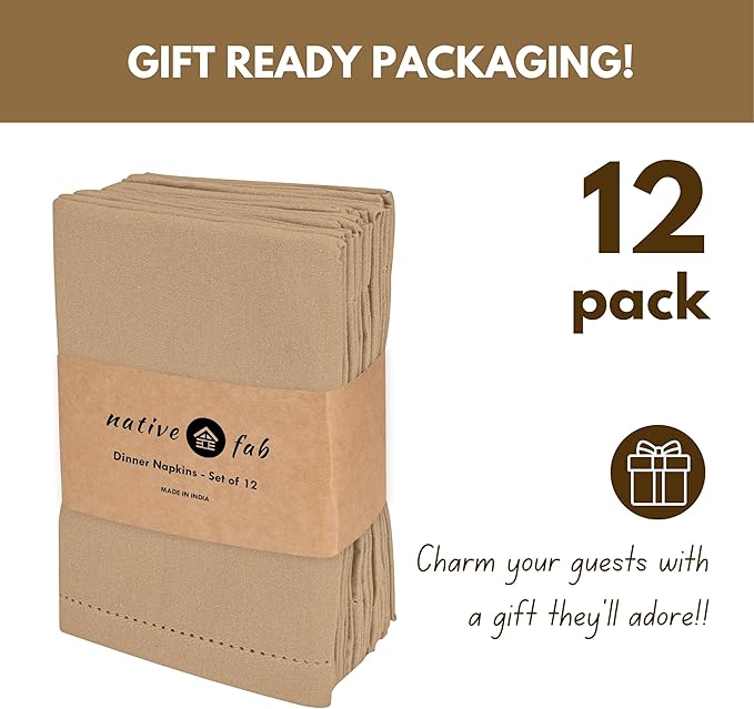 Native Fab Cotton Cloth Napkins, 18 x 18 inch, Set of 12, Hemstitch Tailored Corners, Soft, Absorbent, Washable Fabric, Table Napkins for Fall, Thanksgiving, Holiday, Dinner, and Everyday Use - Beige
