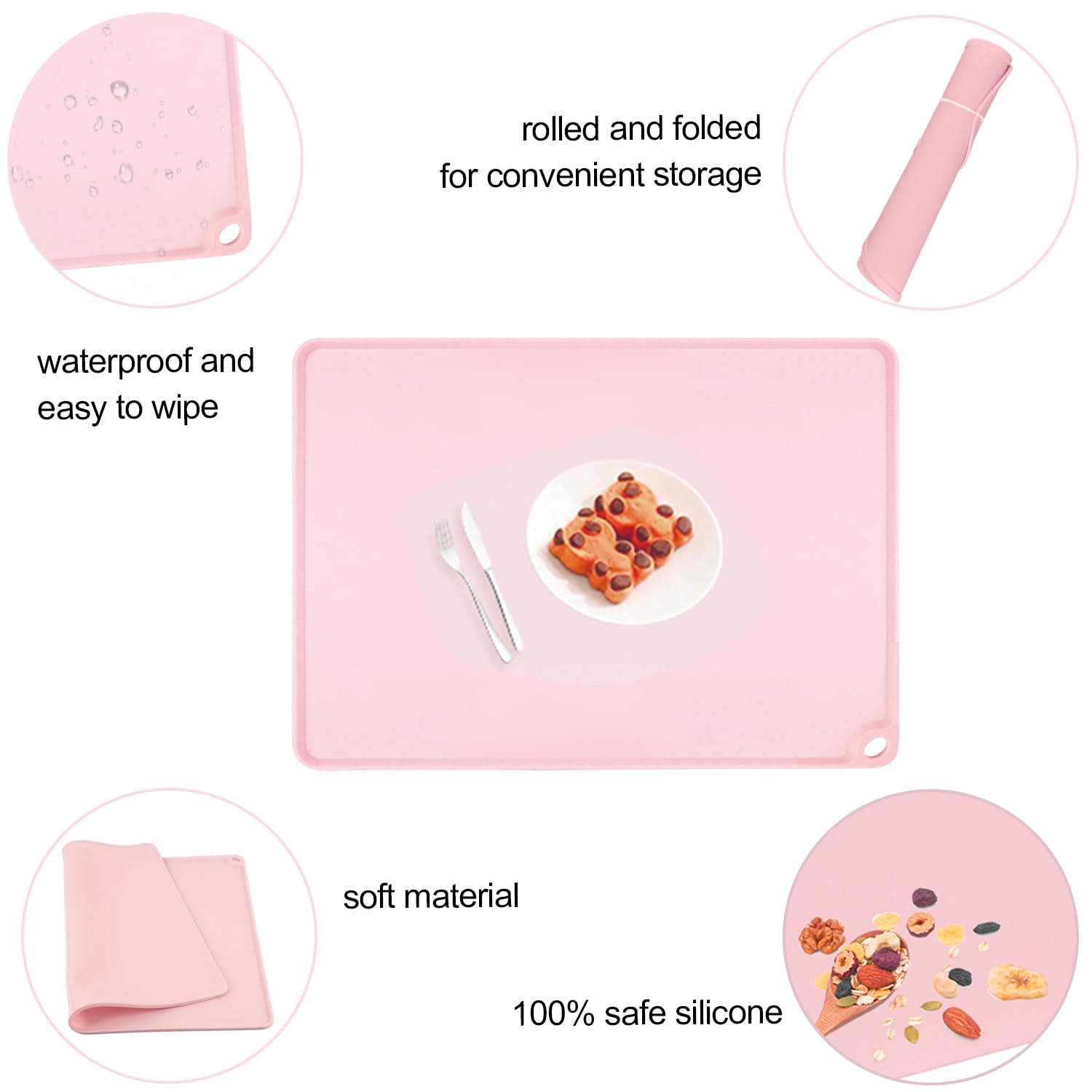 - 💕Easy to Clean and Store: Simply wash the silicone baking mat with warm soapy water and wipe it clean with a soft cloth. No residue will be left on the surface. The small holes on the side of the mat allow for easy hanging and air-drying in your kitchen. Place mats for kids pink can also be rolled up or folded, taking up minimal kitchen space compared to wooden pastry boards.
