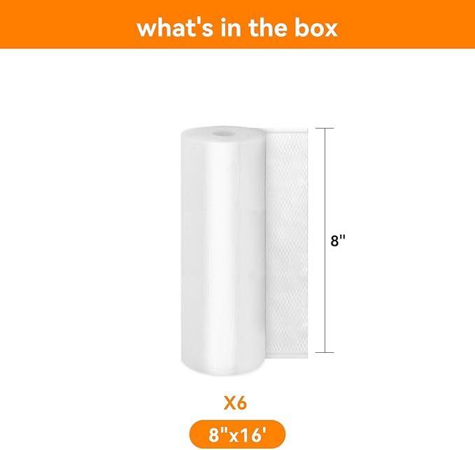 - HEAVY DUTY AND PUNCTURE PREVENTION - 6 pack of 8 inch by 16 feet rolls with embossed channels to increase suction, keep fresh without freezer burn or dehydration