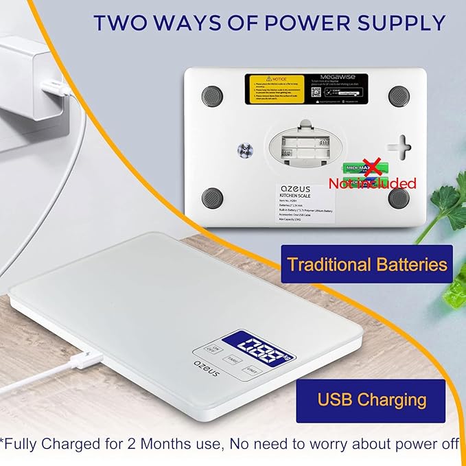 - USB Rechargeable and Tempered Glass : This food kitchen scale is recharged by USB, fully charged one time could last 2 months even you use it every day, compared to others with batteries, it is more convenient and environmental. And the panel use tempered glasses, which is anti-print and so easy to clean.