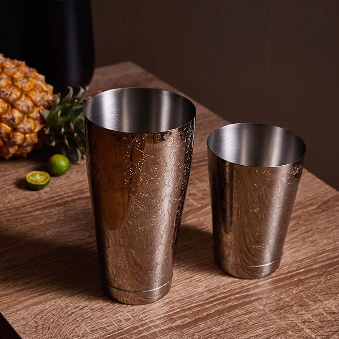 - The elegance of the Bar tools kit and its premium quality stainless steel just shines out with perfect grace and will add royalty to your kitchen. It has the classic delicate engravings from ancient times. Only a Boston shaker set like this can match the nobility and stature. The black colored cocktail shaker set will make you feel like a Knight of the middle age.