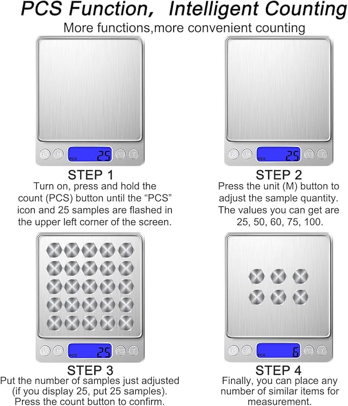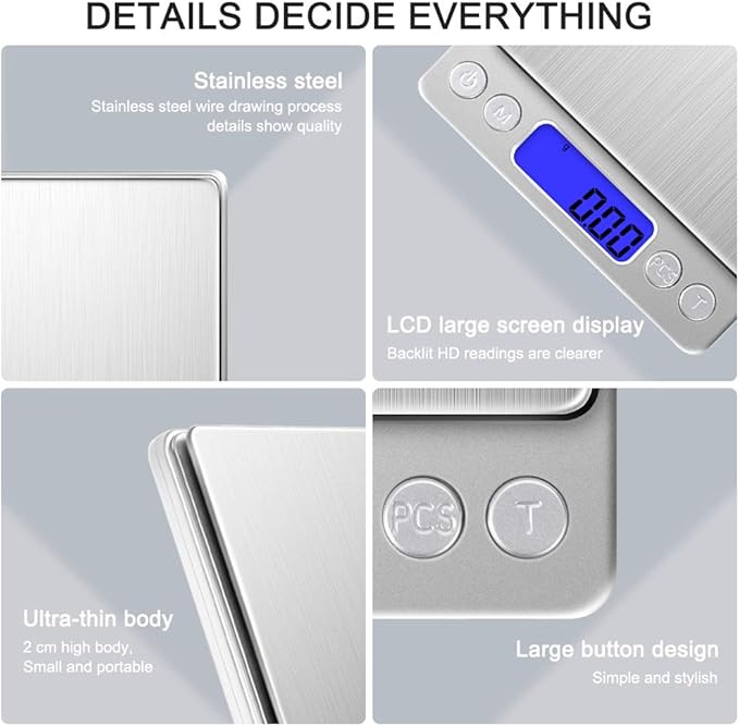 - 【Tare & PCS, Auto Power Off Function】After placing the container, press the T button to tare and get the net weight of the item being weighed. For items such as screws and needles, the PSC button can be used for counting. The M button can be used to switch units and set the automatic shutdown time, 60 seconds, 80 seconds, 120 seconds for options. And There is also a LCD backlight function to know the reading clearly at night. Besides, it can alert users for low battery power and overload