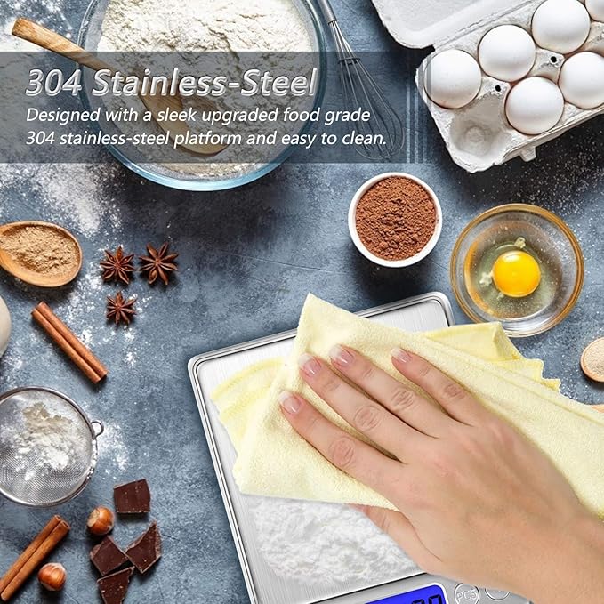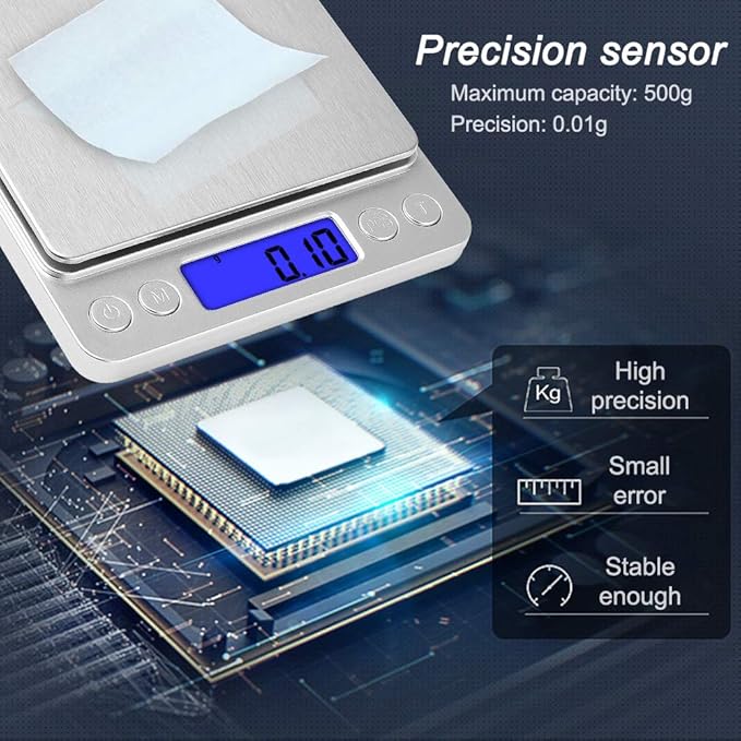 - 【High Precision, Wide Range】 The ultra-high accuracy sensor can achieve accurate readability of 0.01g and allows you to weigh a maximun capacity of 500g.(Recommended: weighing from 0.03g) It is very easy to clean and use, make it idealy to weighing such as yeast, valuables jewelry and diamonds that require high weighing accuracy