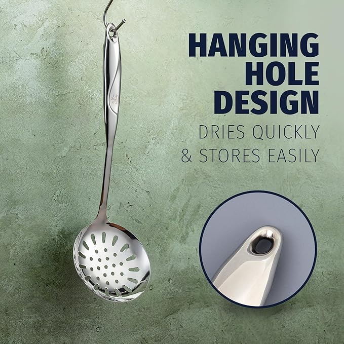 - EASY TO CLEAN AND STORE: Our stain-resistant mirror finish frying spoon is super easy to clean. Simply toss it in the dishwasher or hand wash under running water. You can use the built-in hole in the handle to hang the stainless steel slotted spoon after use.