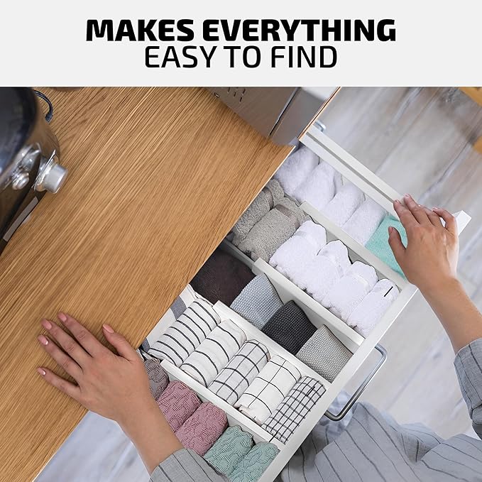 - ✅ EASY & SECURE INSTALLATION: Quickly install these dividers without the need for tools. The strong, spring-loaded mechanism ensures they remain firmly in place, even with daily use. Additionally, the EVA foam at each end prevents slipping and protects your drawers from scratches or pressure damage, ensuring both stability and safety.