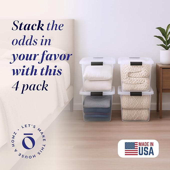 HOMZ 4-Pack Latching Lid, Large Clear Plastic Storage Bins with Lids, 31 Quart, Gray Latch - Stackable Container Boxes for Home, Bathroom, and Office Organization