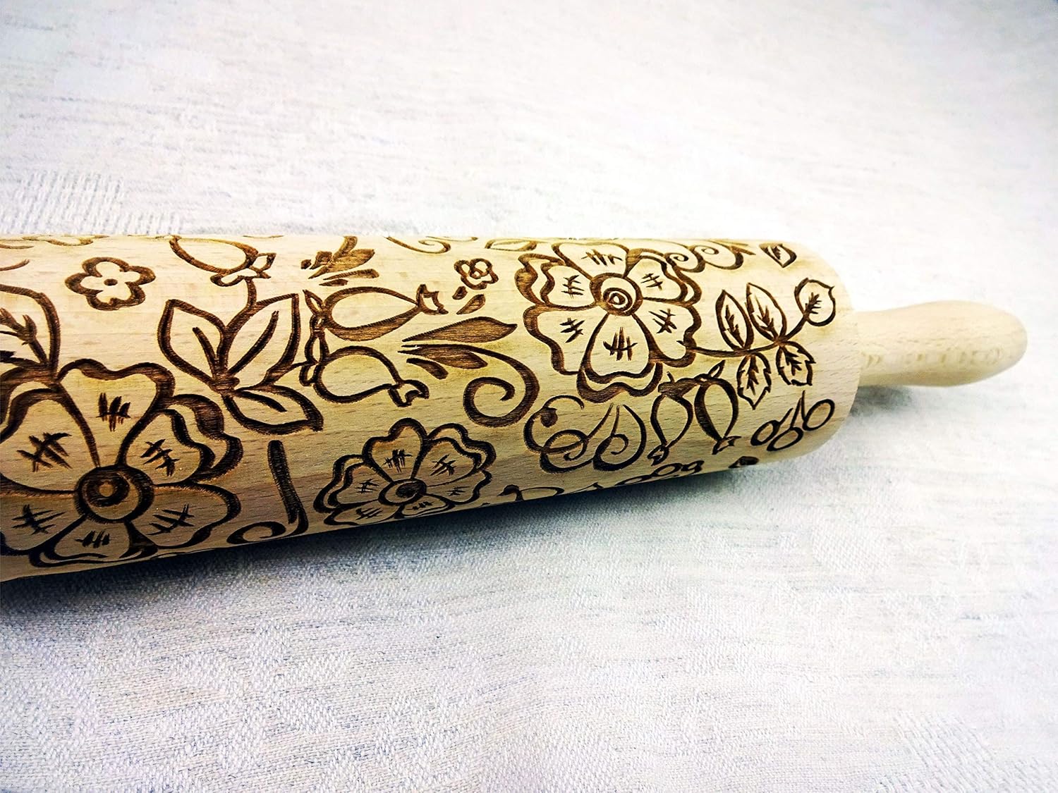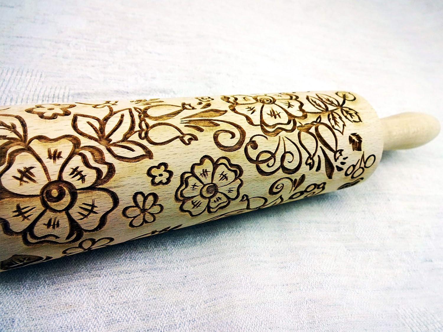 ROSEHIP FLOWERS EMBOSSING ROLLING PIN LASER ENGRAVED with ROSESHIP FLOWERS GIFT for MOTHER FRIEND