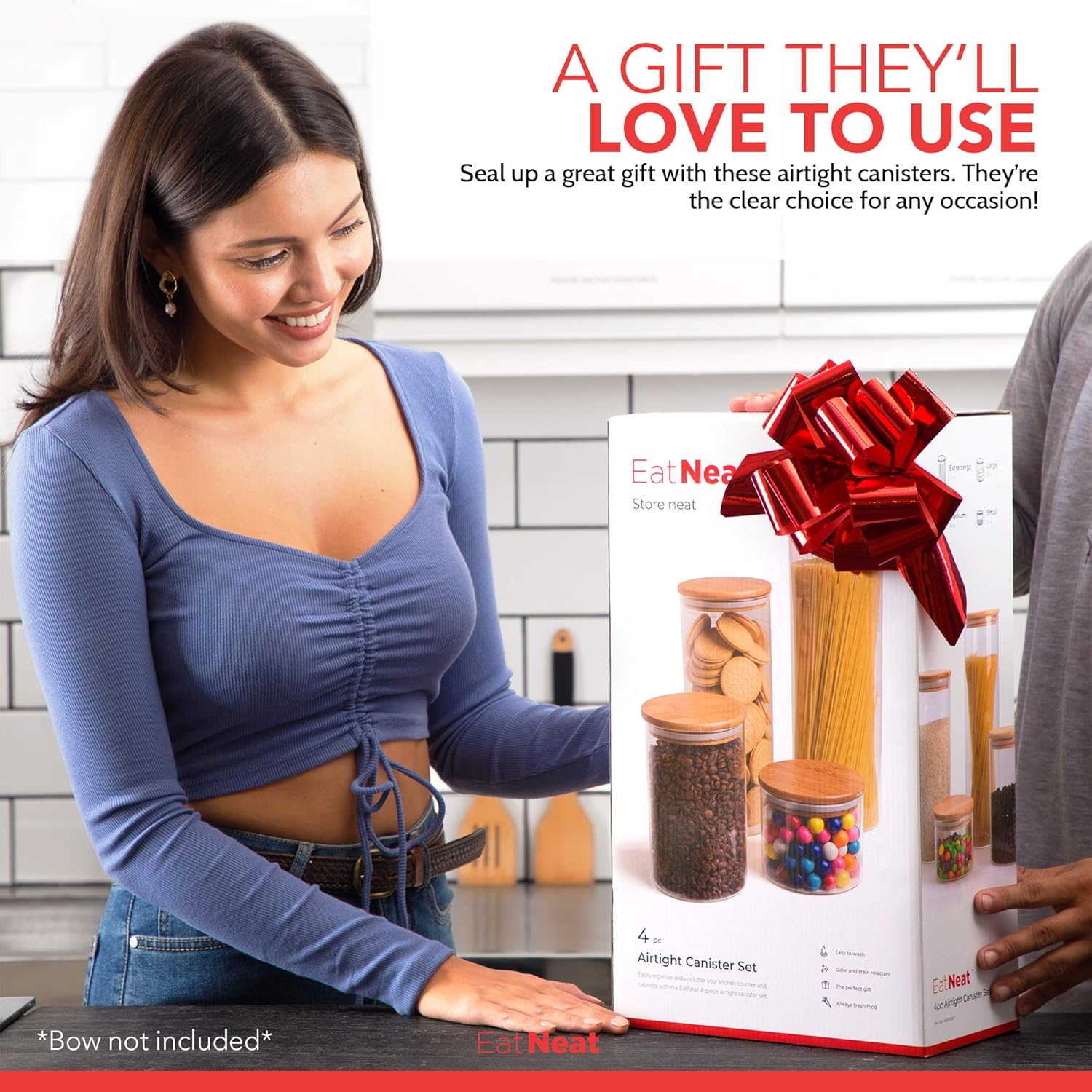 EatNeat 4‑Piece Glass Canister Set with Airtight Bamboo Lids – Giftable Kitchen Storage – Tall Jar Fits Spaghetti – 74/56/36/20 oz for Pantry, Dry Goods, Coffee, Snacks & More