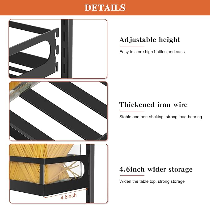 - HEIGHT ADJUSTABLE: X-cosrack wall mounted spice rack can be adjusted up and down according to the height of jars; Mention that the 4.6-inch-wide basket is designed to fit larger items, such as big bottles and cans, providing compatibility with a wide range of kitchen essentials.