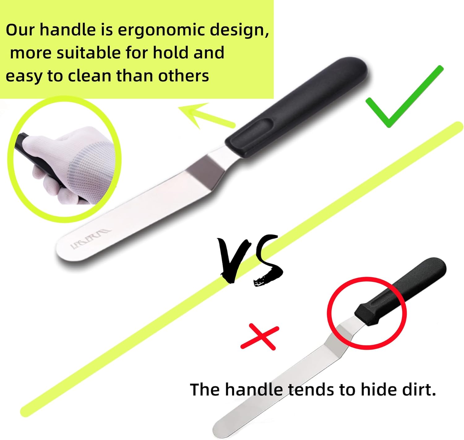 - 【More convenient and safe】Angled Spatula of 4 inch 6 inch is more convenient and safe. Professional Baking Frosting Palette Knife Designed with a handle with rounded edges, improves the grips and does not slip off easily. The handle is evenly weighted to help give smooth and balanced operation.