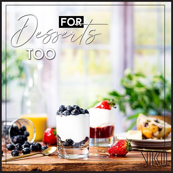 - EVERYDAY CLASS: Simple and practical is what defines these mini juice glasses from Vikko. Short and wide, our small glasses feature a heavy bottom to prevent tipping (makes for a gorgeous profile, too, when filled!) and a seamless design for an extra touch of elegance.