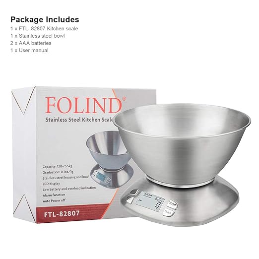 - 【PRACTICAL DESIGN】The food scale is made of stainless steel, which is durable. The included detachable bowl (2. 5L) for easy mixing and pouring, you can also use your own bowl or plate instead. Perfect for baking, cooking, weighting small package etc.