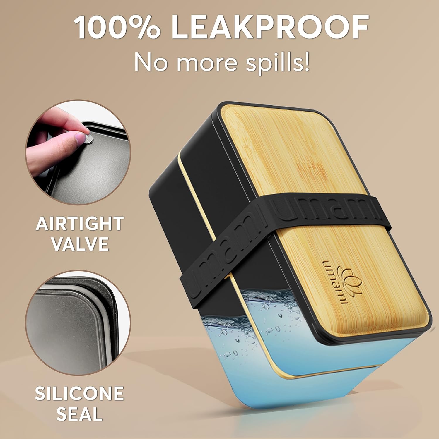 Umami Bento Box Adult All-In-1 w/4 Utensils, Big Sauce Jar, 2 Dividers, 100% Leakproof, Microwave & Dishwasher Safe, Stackable Bento Lunch Box Containers for Men/Women, Black & Bamboo, 40 oz