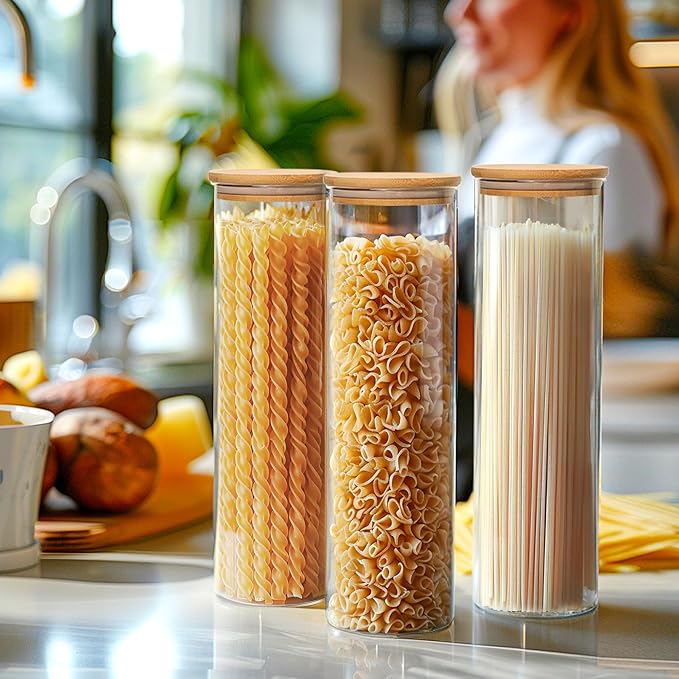- Clear Kitchen Jars: Enhance your kitchen organization with our round pasta storage containers, featuring a transparent design; the see-through glass allows effortless monitoring of food level, enabling you to track usage and assess food storage condition