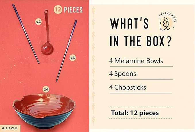 4 XL Ramen bowl set. 12 Pieces Pho Bowls. Asian Japanese soup. Utensil: Spoons and Chopsticks kit. Melamine, Large 52 oz. Noodles, Rice, Udon, Thai, Chinese, Korean, Udon, Wonton, Miso, 9 inch