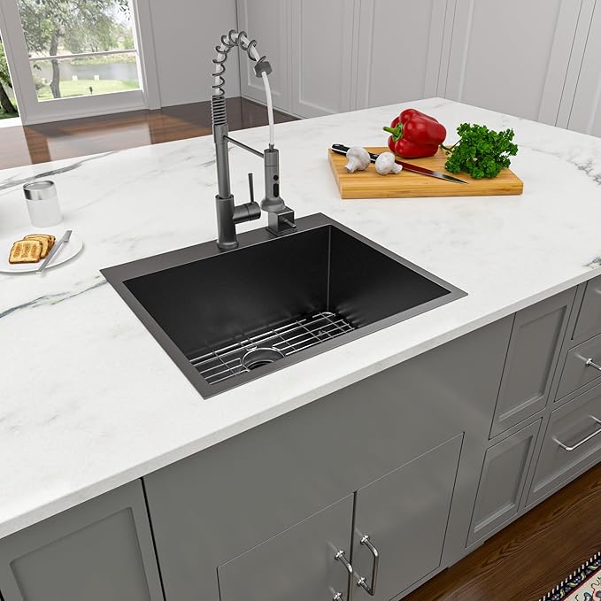 Lordear 25 Drop In Kitchen Sink 25 x 22 inch Gunmetal Black Drop Sink 16 Gauge Stainless Steel Single Bowl Topmount Over Counter Bar Prep Kitchen Sinks Basin