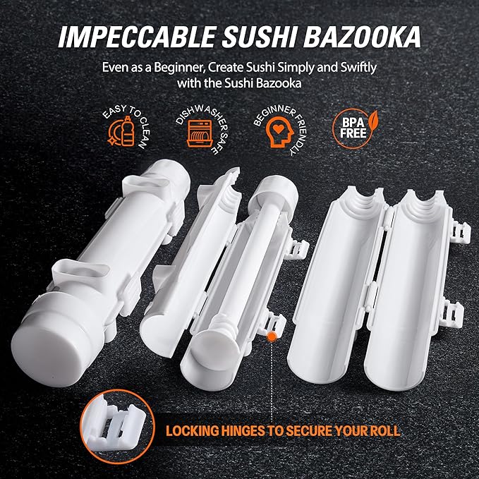 - 【Packing List】Sushi Bazooka, 2pcs Bamboo Mat, Paddle, Spreader, Sushi Knife, 4pcs Bamboo Chopsticks, 4pcs Chopsticks Holder. This kit has everything you need to make sushi in just a couple of minutes.