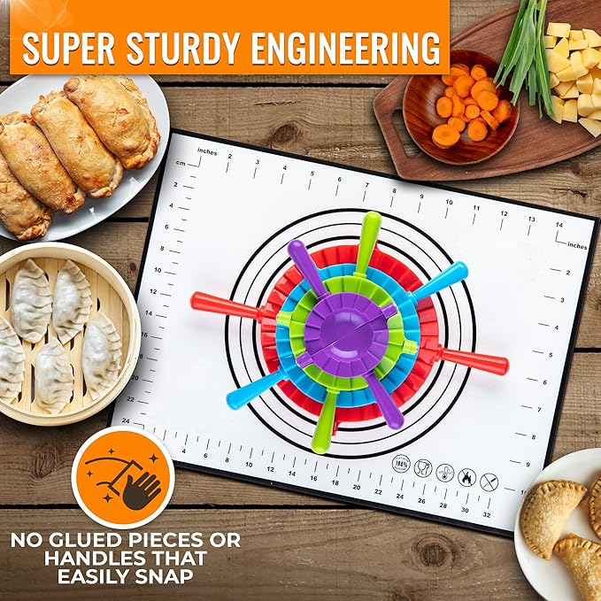 - BONUS PASTRY MAT; Each set of dumpling, empanada and ravioli molds comes with a free non stick pastry mat; Measuring a generous 15,75” x 11,8”, the pastry mat features convenient measurement patterns and is the ideal prep surface for delicious Jamacain beef patties, pot stickers, empanada dough and more