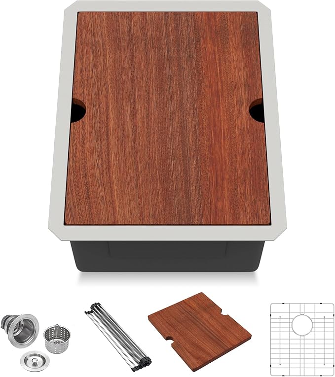 - Perfect Size and Comprehensive Package: Measuring 15'' x 19" x 10’’, this sink fits into a minimum cabinet base of 18 inches. The 3.5-inch standard draining opening is compatible with most garbage disposal units. The package includes a stainless workstation bar prep undermount sink, bottom protective grid, wood cutting board, drain assembly, roll-up rack, cut-out template, and installation instructions—everything you need for a seamless installation and use.