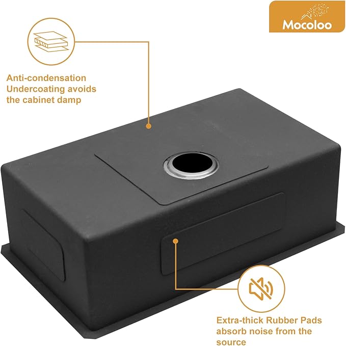 - Fast Drainage & R10 Design: Mocoloo undermount kitchen sink with an X-shaped groove design and sloped bottom for more rapid drainage. The 2 mm-thick rubber pads and coating on the back are added to absorb noise and vibration, which helps prevent condensation on this stainless kitchen sink, thereby protecting your cabinet. Unique 10 mm radius inside corners offer a slightly curved corner for easy cleaning and add a resolutely modern look to this 33 undermount sink