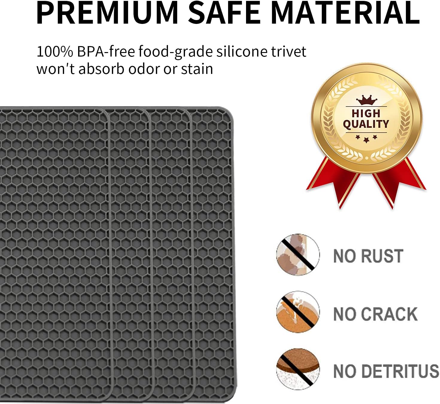 - đăPREMIUM SAFE MATERIALă- The silicone trivet made from 100% BPA-free food-grade silicone, exposure to food safety. silicone pot mat flexible, great to grab, the tensile property is good and the service life is long. Our Silicone pot holders has a much better anti-slip performance than regular cork and bamboo pots.