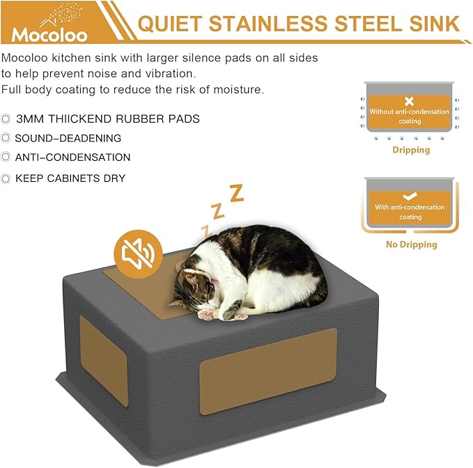 - Top Stainless Sink Sink Material: Mocoloo undermount bar sink is made of T304 food-grade stainless steel in 16 gauge for superior strength and durability. Heavy duty sound guard undercoating and softer rubber noise reduction padding to absorb vibration and minimize noise while the stainless steel single bowl deep sink is in use