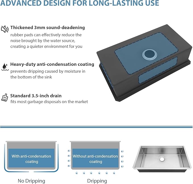 - Efficient Drainage: X-shaped water guideline and sloped drain area ensure thorough water drainage, reducing maintenance. 3.5" offset drain hole accommodates garbage disposal units, enhancing kitchen convenience