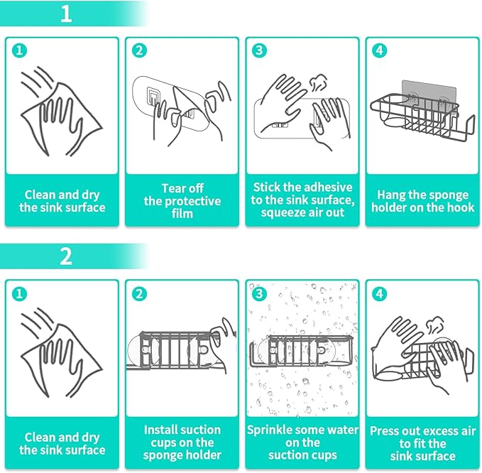 - [2 Installation Methods]: 1. You can use the adhesive to fix, adhesive allows the sink caddy firmly on the hook without falling. 2. You can use the suction cups, please sprinkle a small amount of water before installation to ensure better suction
