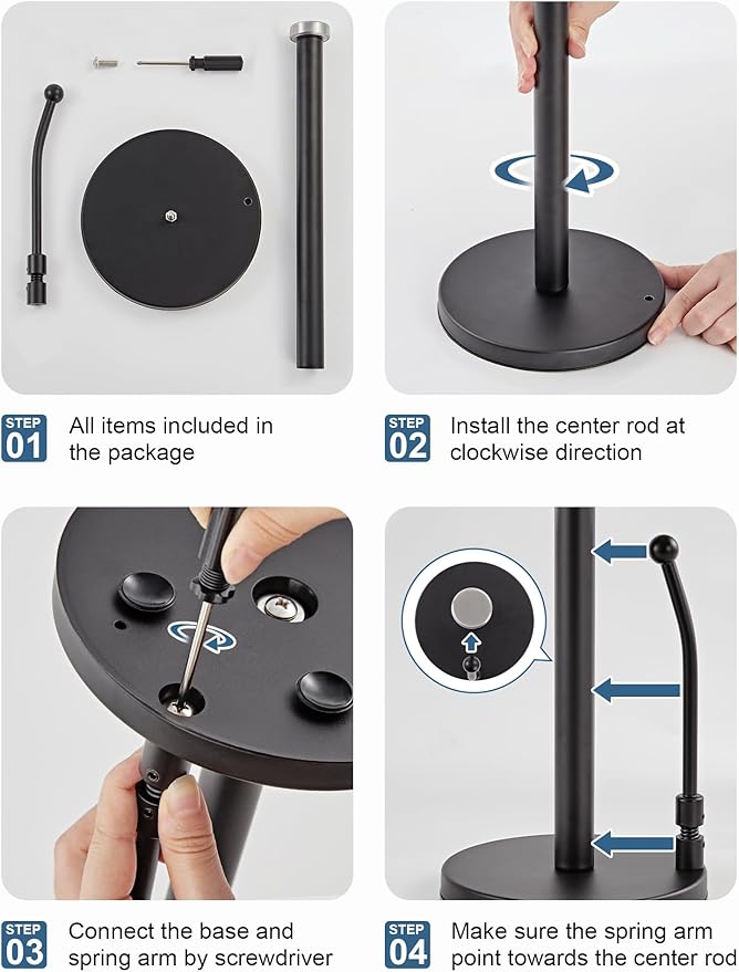 - Suction Cups Design: Equipped with 4 suction cups under the base, ensuring a firm grip on countertops, dinner tables, etc. Avoids sliding and skidding, a must-have standing paper towel holder for your home.