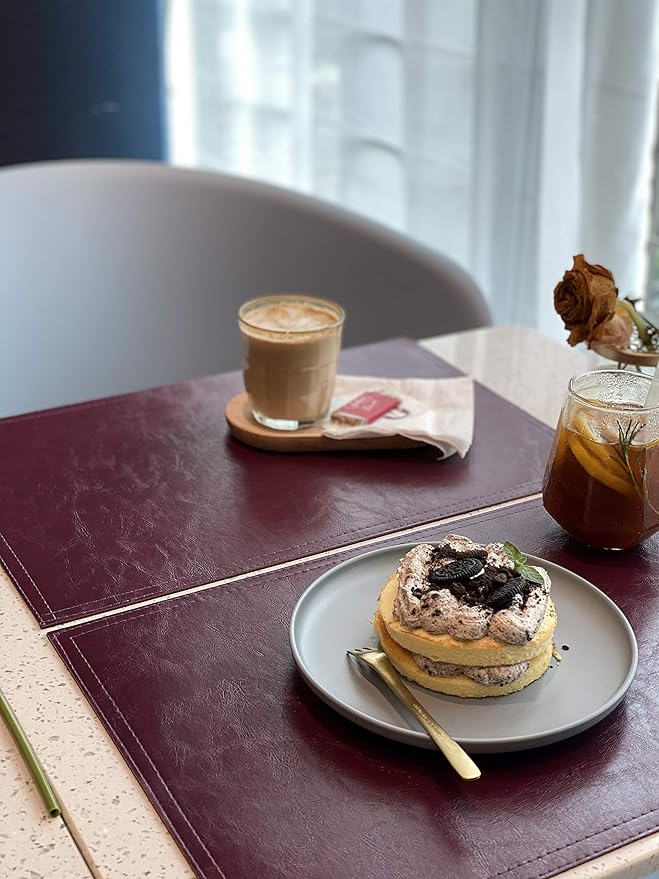 Waterproof PU Placemats, Faux Leather Dining Table Mat, Set of 4, Easy to Wipe Off Scrub Vinyl Mat, Heat & Stain Resistant for Office Conference Table, Home Decor G Bordeaux