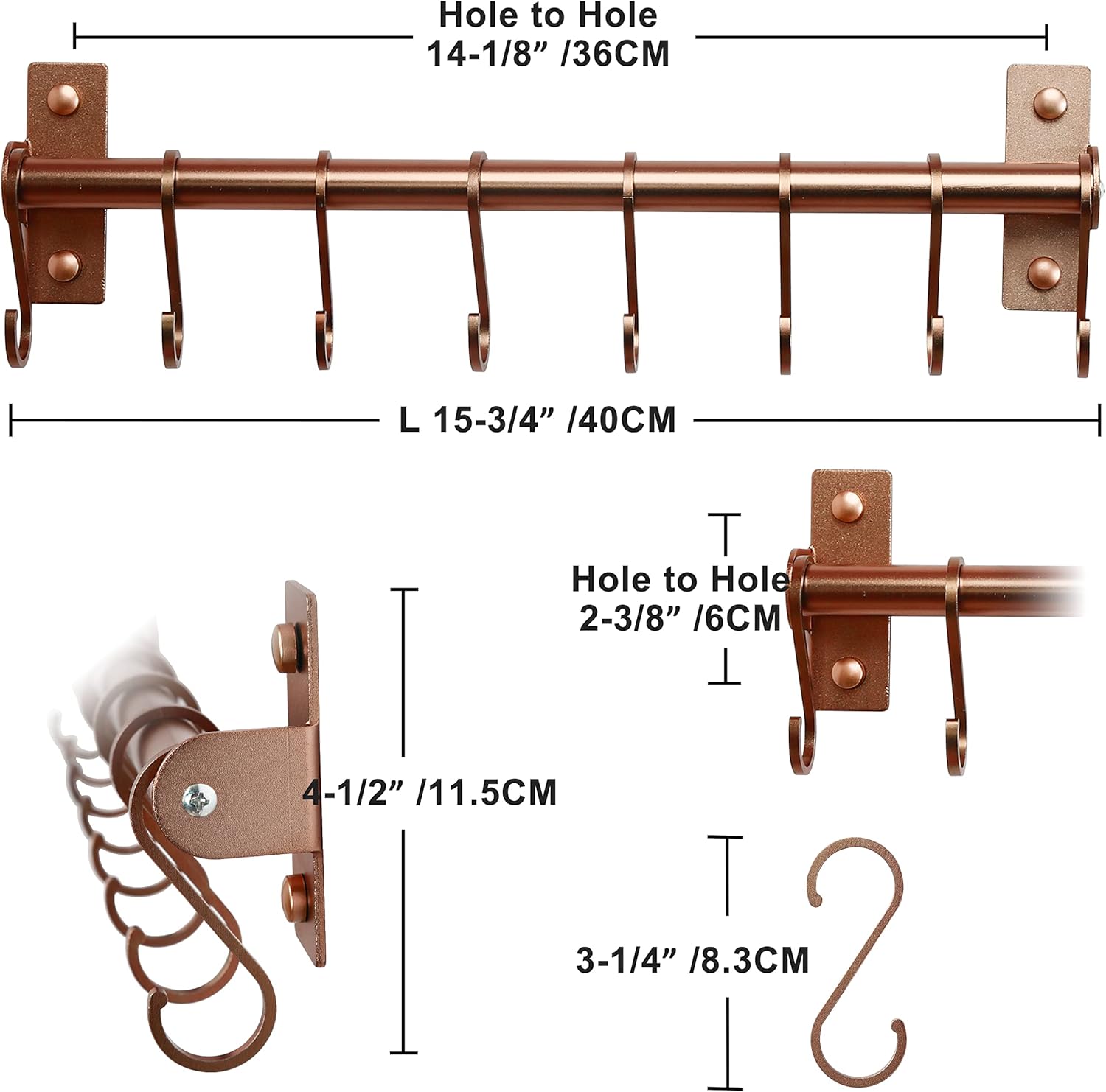 - Easy to install, sizes: 15-3/4 L x 4-1/2 H x 1-5/8 inch, including 1 x kitchen rail with 8 S hooks, mounting hardware, rose gold color,