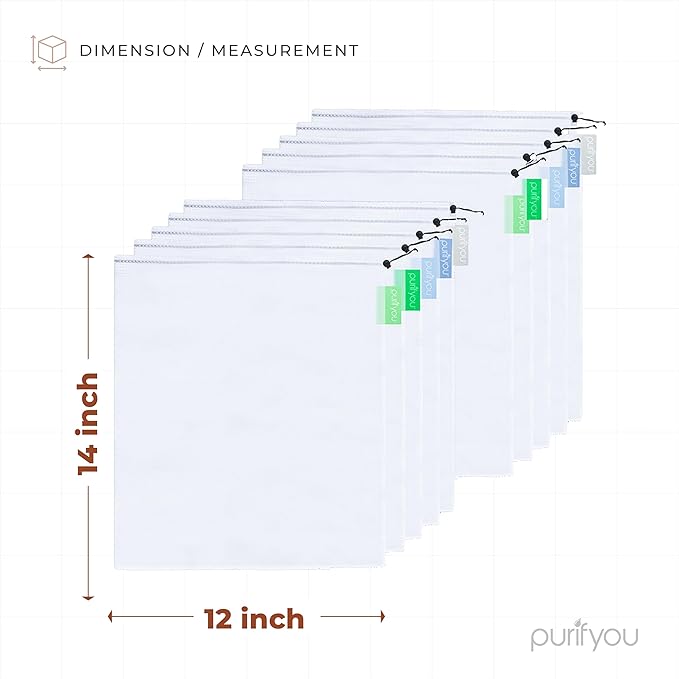 purifyou Set of 10 Reusable Produce Bags - Large (12x14), Farmers Market Bags, Washable Shopping Bags, Gift Bags, Storage for Fruits, Vegetables, Toys, Groceries, Kitchen and Home Organizer