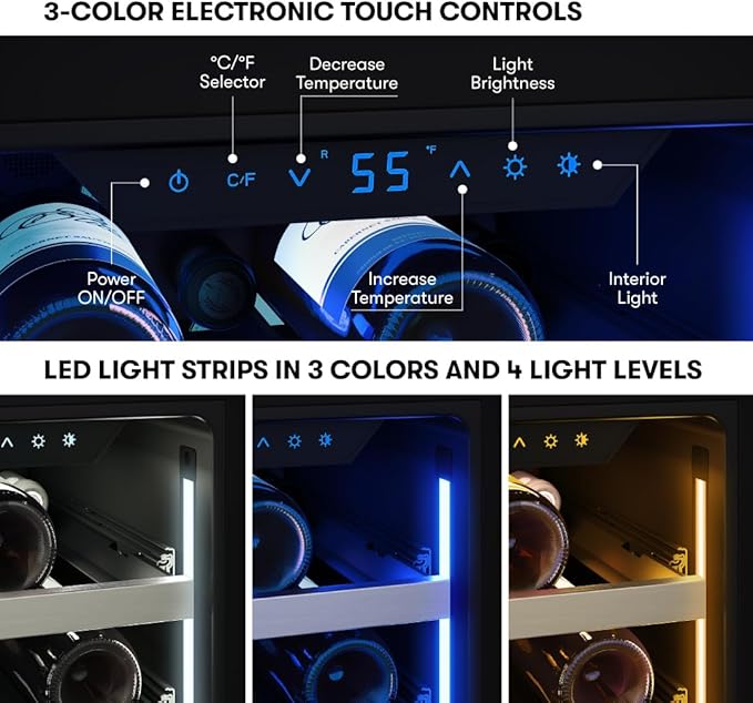 - Temperature Range: 40° - 65° F / 3-Color LED Lighting in Cloud White, Deep Blue and Amber / Full-Extension, Black Wood Racks with Stainless Steel Trim (6)