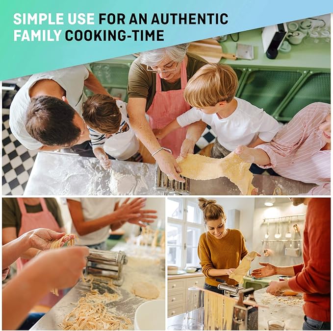 - ⚙️ 7-ADJUSTABLE THICKNESS PASTA MAKING MACHINE: The secret to the perfect pasta dish is choosing the right thickness for every type of pasta. Our manual pasta maker has 7 thicknesses settings that allow you to roll your pasta dough perfectly thin (for ravioli) or thicker (for lasagna). The pasta rollers are efficiently flattening the dough to the preferred thickness and the cutters are slicing the dough into pasta strips. Get the best result and collect all the compliments of your guests.