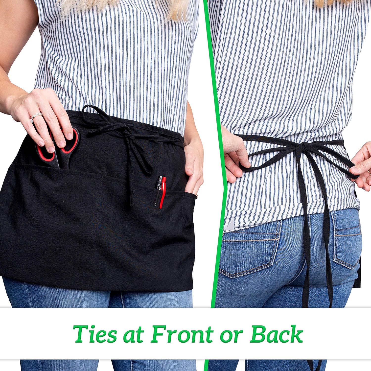 - Commercial Grade: black aprons for servers are perfect for servers in Restaurants , Bars, Cafés , or at Home in the Kitchen, Garden, or Craft Table. These Comfortable, Durable, Light Weight and Cotton Enriched waist aprons comes with 3 pockets and you can wear them for all your serving needs.