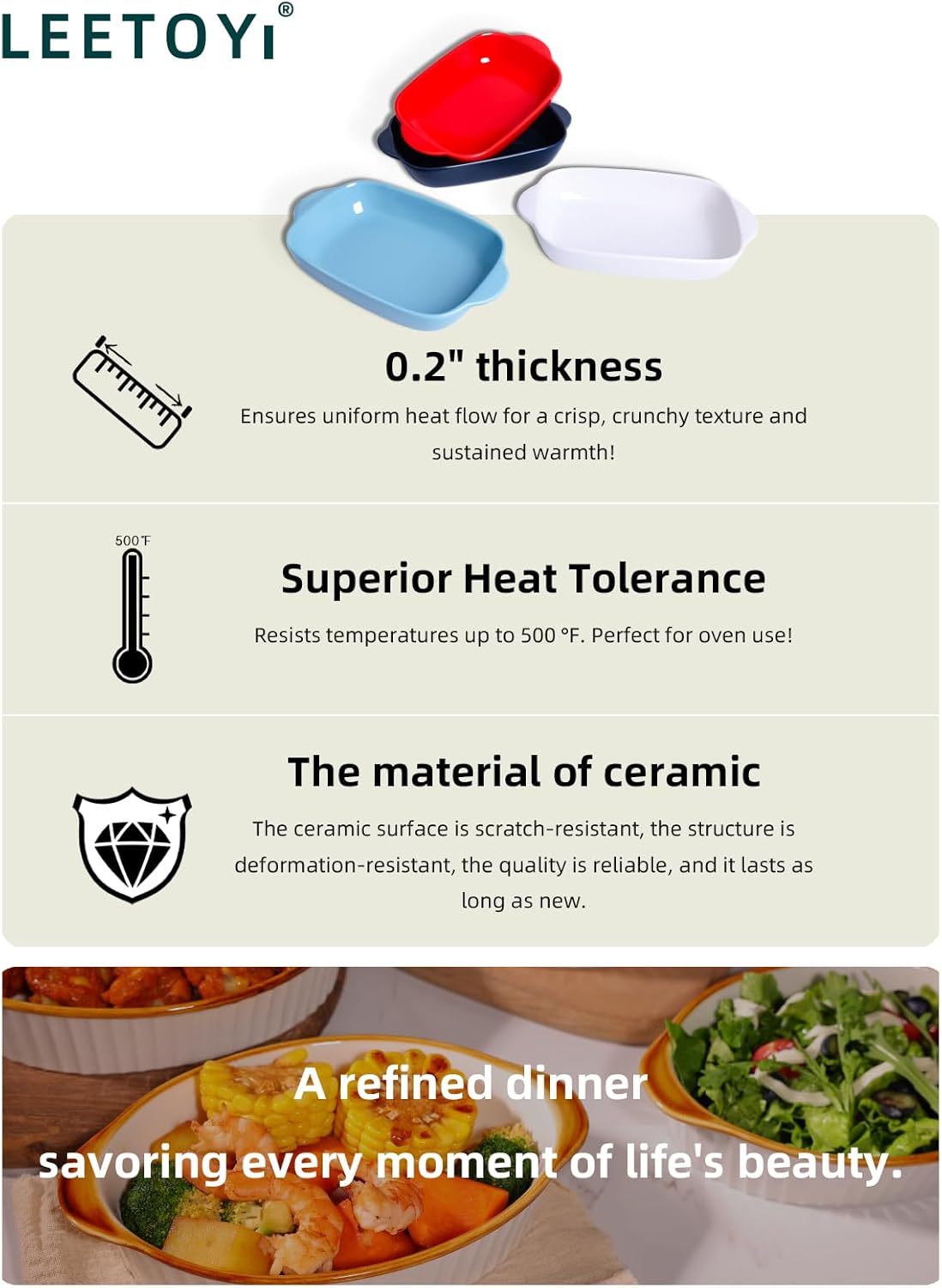 - Ceramics:This Baking Dish is made of ceramic.The baking set surface is smooth and bright, and it is very easy to clean.At the same time,It can be used in the oven, microwave, freezer and dishwasher.