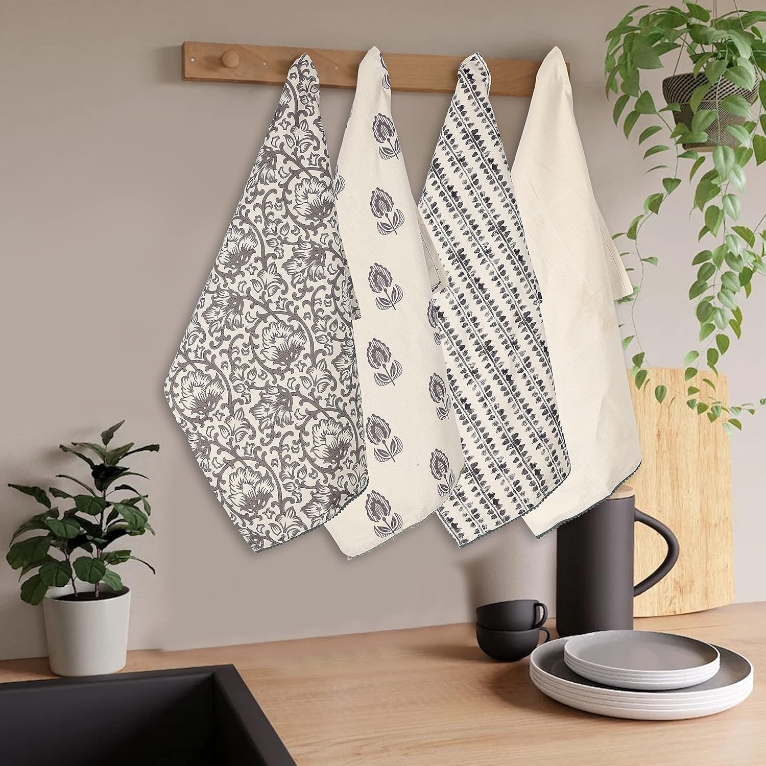 Kitchen Towels Dish Towels for Kitchen- Gray & Beige Tea Towels for Kitchen-Bar Towels for Kitchen-KitchenTowels and dishcloths-Printed Floral 18"x28" Pack of 4