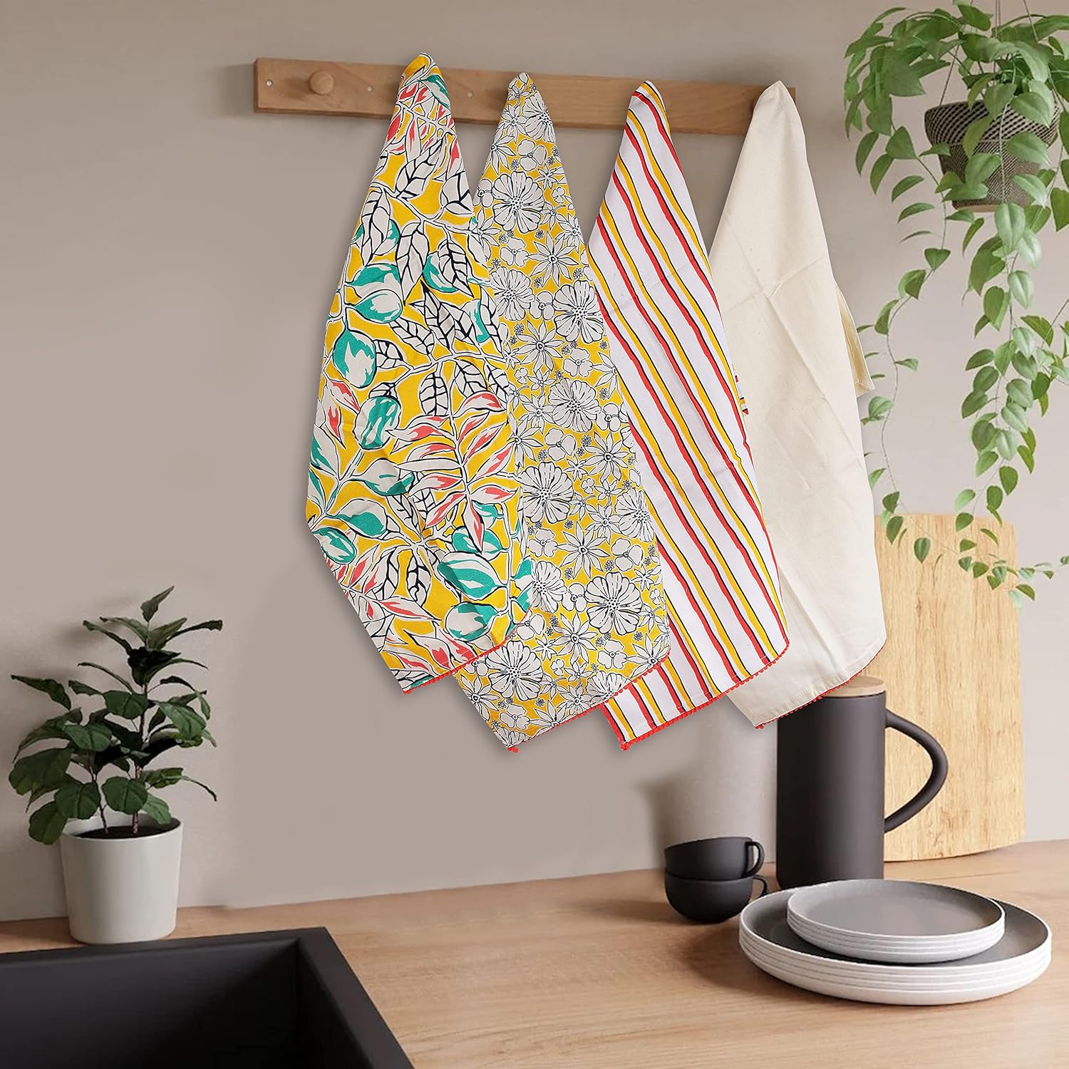 Valentine's Printed Kitchen Dish Bar and Tea Towels Cotton, 18x28 inch with Trims, Cotton Dish Towel Sets (Yellow, Set of 4)