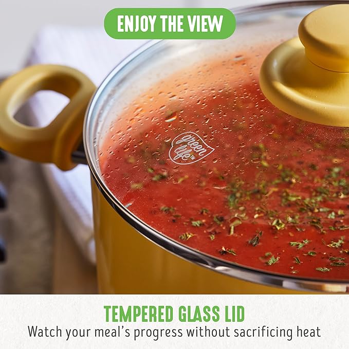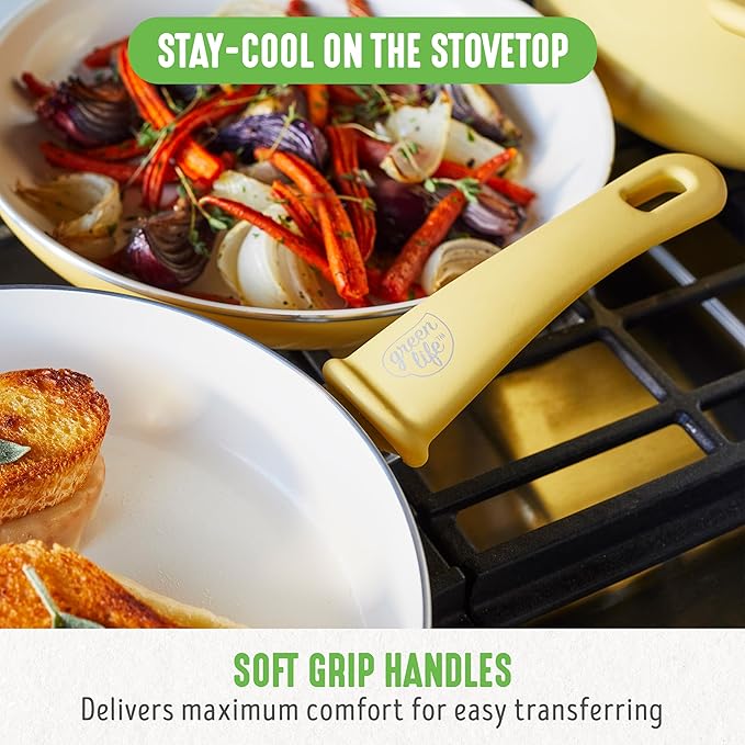 GreenLife 16 Piece Nonstick Cookware Set, Soft Grip Non-Toxic PFAS-Free Ceramic Pots & Pans, Dishwasher & Oven Safe, Frying, Sauce, Saute, Utensils, Glass Lids, Stay-Cool Handles, Wobble Free, Yellow
