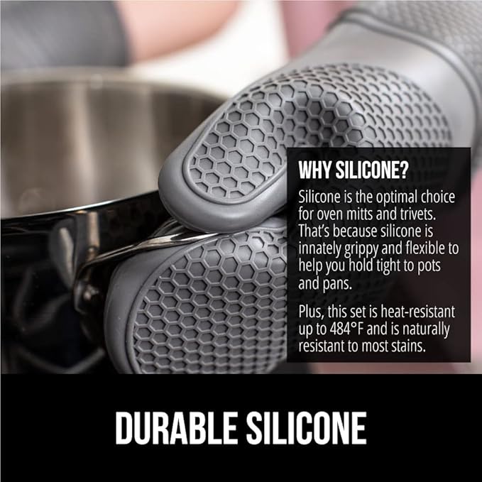 GORILLA GRIP BPA-Free Soft Silicone Oven Mitts and Pot Holders Sets of 4, Heat Resistant Waterproof Cooking Gloves, Thick Cotton Lining, Flexible Gripping for Baking Grilling, Kitchen Trivets, Gray