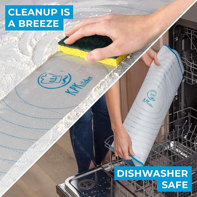 - π CLEAN UP IS A BREEZE! Because our dough rolling mats are super easy to clean & dishwasher safe, youβll be able to clean and wipe remaining food easily off or just put them into the dishwasher. This is great because this means you will save so much time by not having to scrub your dough mat for rolling extra large clean. And with our extra large silicone baking sheet size you keep the mess on the dough board and off your worktop.