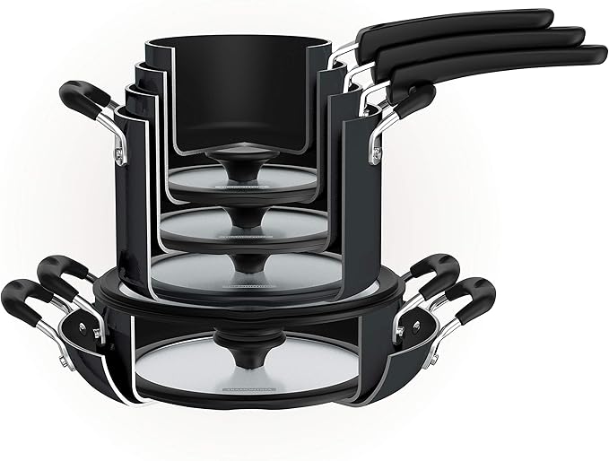 - Convenient Lids & Handles: Tempered glass nesting lids and soft-grip silicone handles provide secure handling and moisture retention
