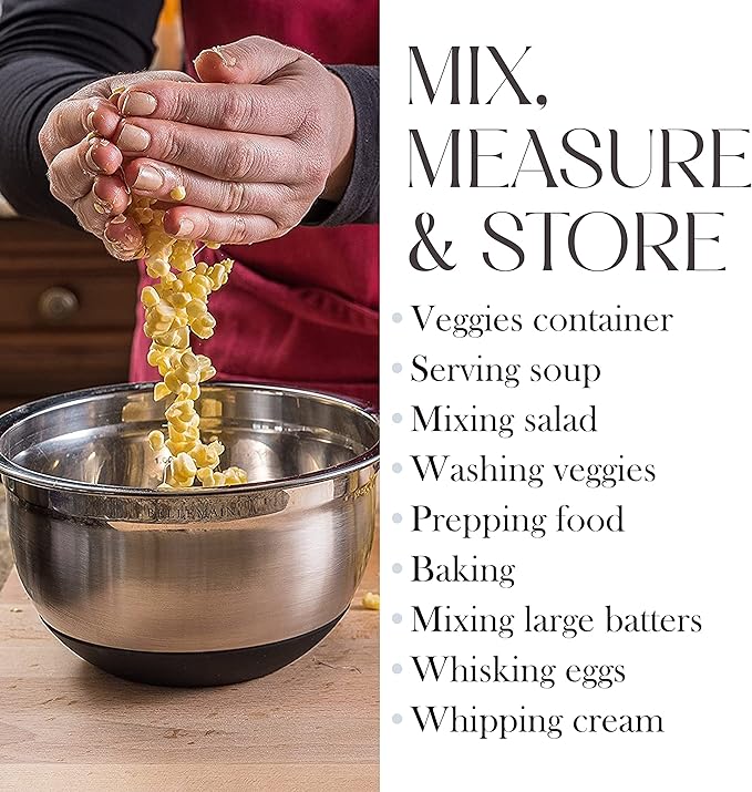 - Non-Slip Silicone, Weighted Bowl Bottoms prevent sliding for ease in mixing your favorite ingredients and baked goods.