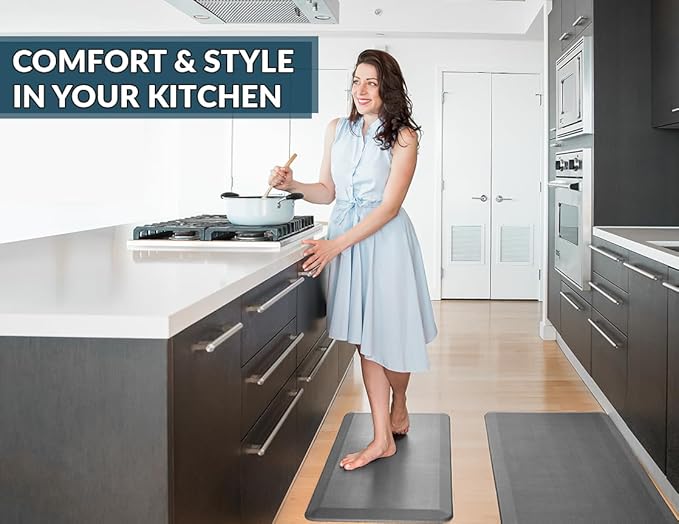 - Slip-Resistant and Stain-Resistant Surface: Stay safe and clean with our anti fatigue mats for kitchen floor that feature a non-slip backing to keep it securely in place. The stain-resistant material is easy to clean and ensures your mat looks new, even with daily use.