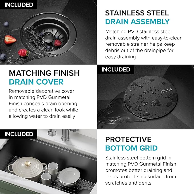 Kraus Kore 33-Inch Farmhouse Workstation with In Sink Dish Drying Rack, Stainless Steel Kitchen Sink Gun Metal Finish, KWF410-33/PGM